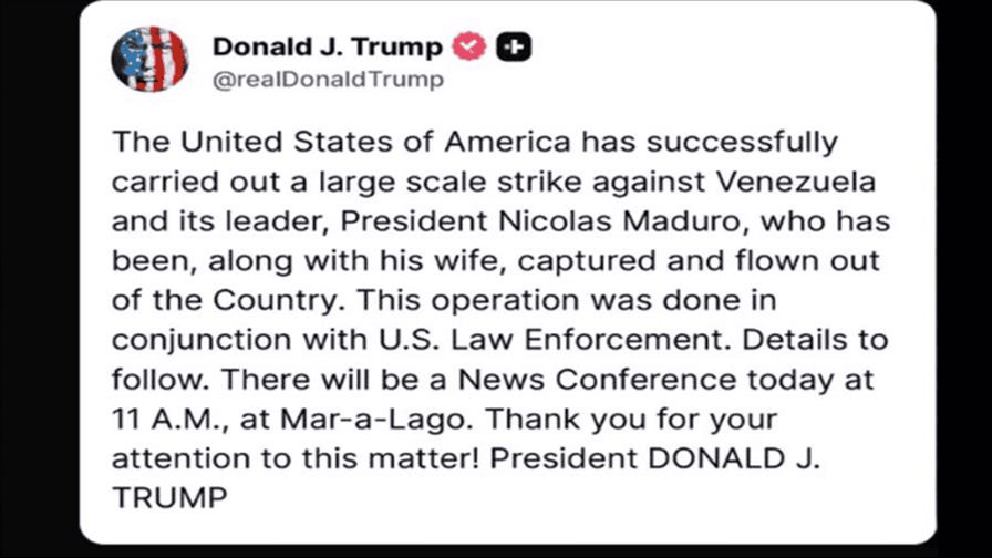En un mensaje difundido en Truth Social, Trump señaló: “Estados Unidos ha llevado a cabo con éxito un ataque a gran escala contra Venezuela y su líder, el presidente Nicolás Maduro, quien fue capturado y expulsado del país junto con su esposa”.