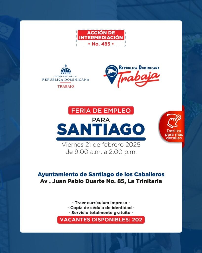 Participa en la Feria de Empleo en Santiago el 21 de febrero de 2025. Oportunidades en administración, almacén, mecánica, recursos humanos y más. Registro gratuito en rdtrabaja.mt.gob.do. ¡No te lo pierdas!